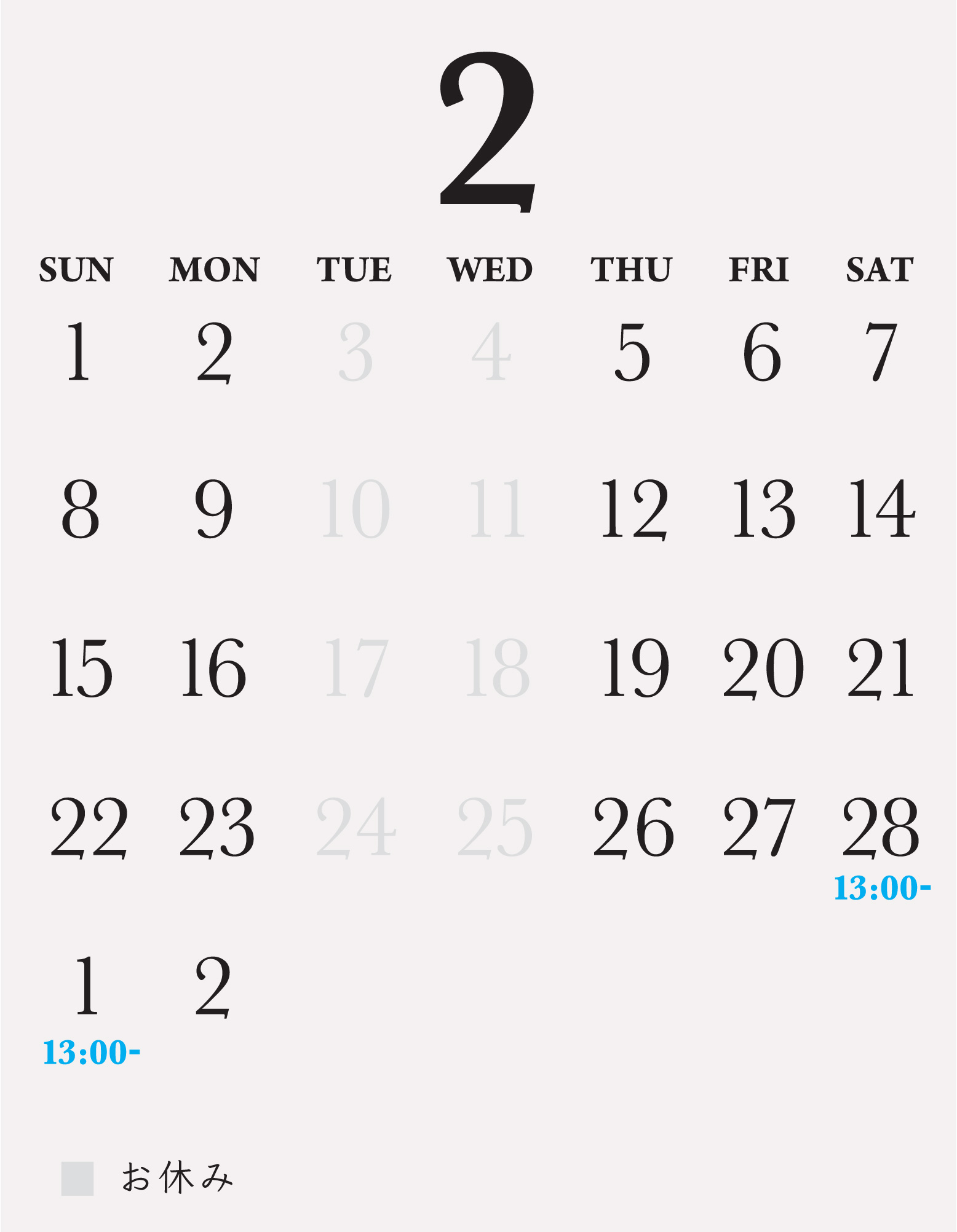 2026.2.27 2月の営業日 営業時間12時〜18時(L.O17時)定休日:火、水曜13時~:28(土)、3/1(日)※お車は必ず乗り合わせでお願い致します※混雑時の場合、お席のお時間を1時間とさせていただきます。